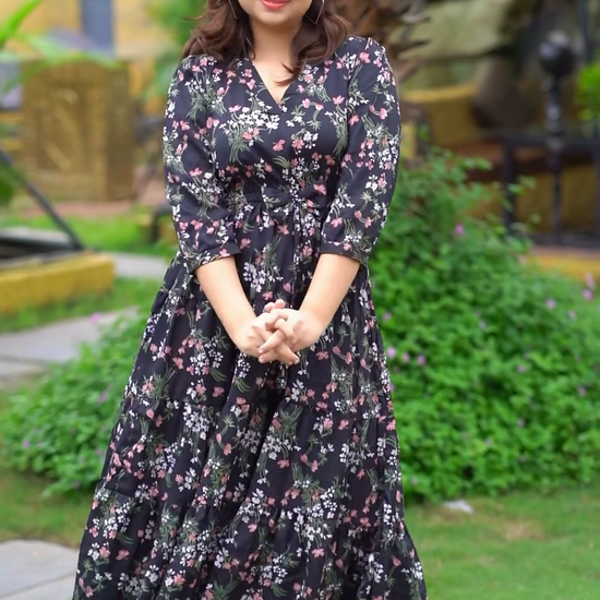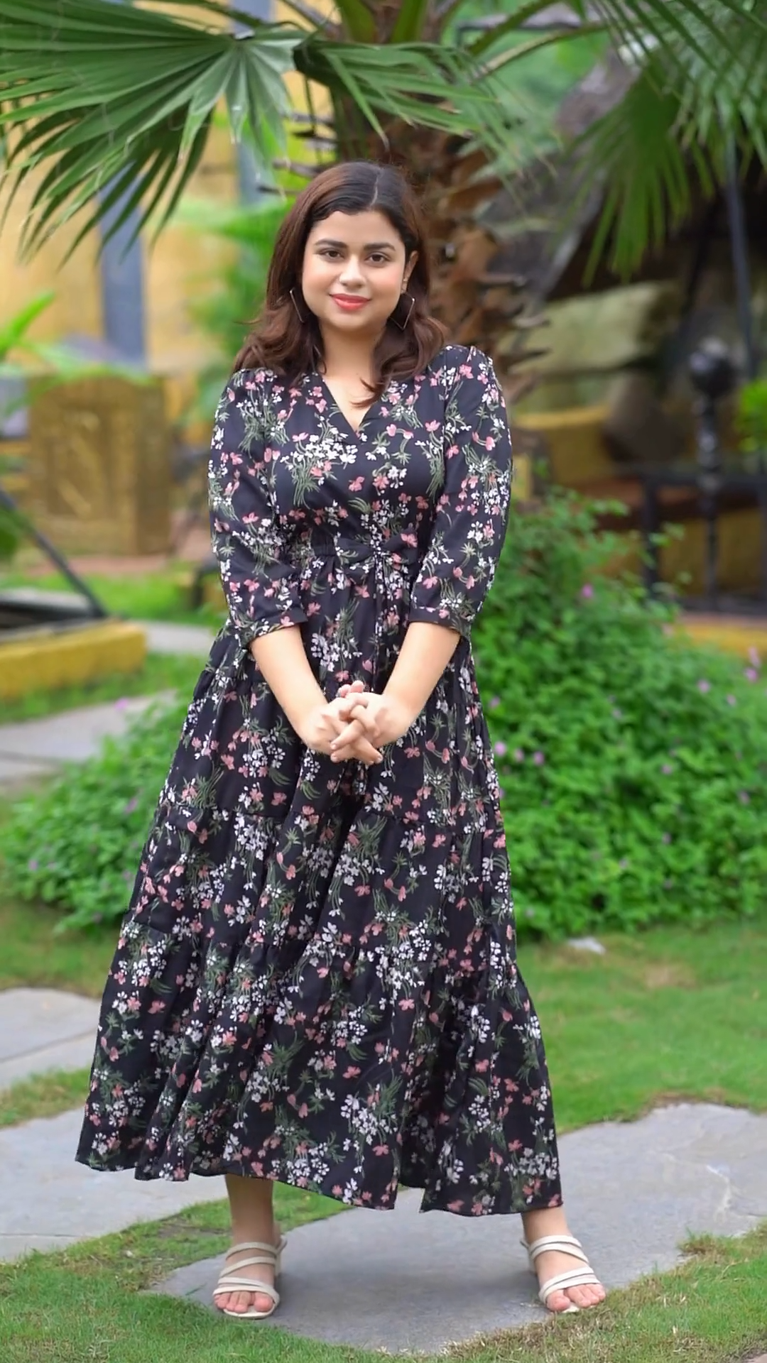 Elevate your wardrobe with this stunning Black Garden Grace Maxi Dress. Crafted from soft crepe fabric, it features a flattering V-neckline, 3/4 puff sleeves, and a flowy silhouette perfect for any western wear occasion. Ideal for both casual outings and semi-formal events.