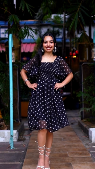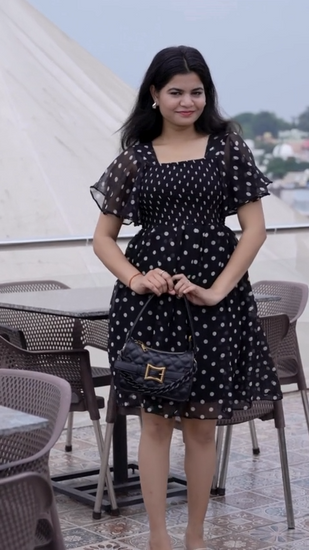 Step out in style with this classic black polka print dress, perfect for any occasion. Crafted from lightweight georgette fabric, it features a flattering square neckline, flared sleeves, and a comfortable Knee Length. The dress is lined with soft Lycra for added comfort. Ideal for Western wear, this timeless piece combines elegance with a playful twist.