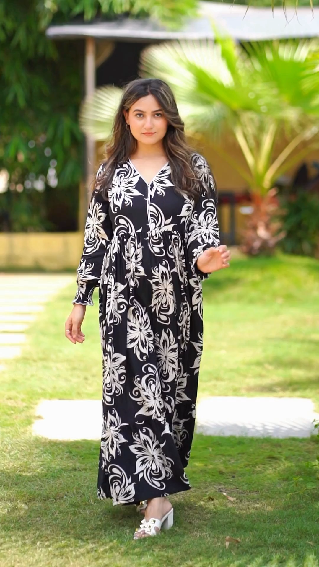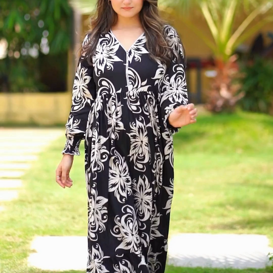 Step into elegance with this Midnight Bloom Floral Print Maxi Dress, crafted from soft rayon. Designed with a flattering V-neckline, full cuffed sleeves, and a flowing silhouette, it's ideal for western wear. Perfect for day-to-night styling with effortless charm.